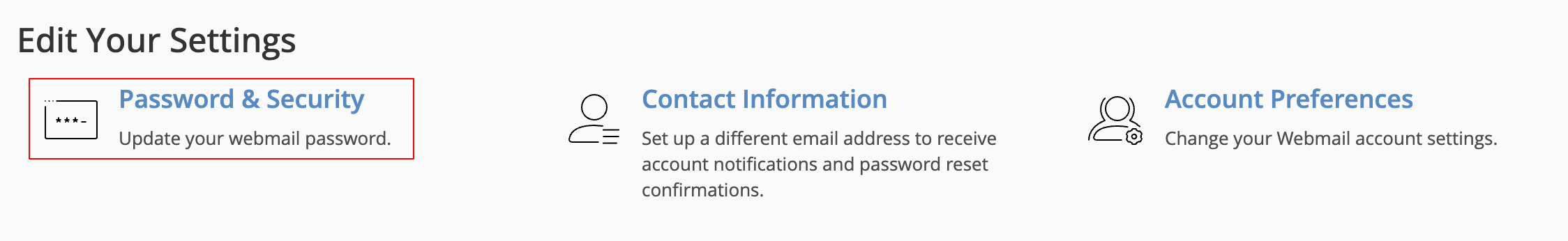 - Once in the webmail dashboard you should see a heading "Edit your settings" under this you should see the "Password & Security" settings link, click on this.